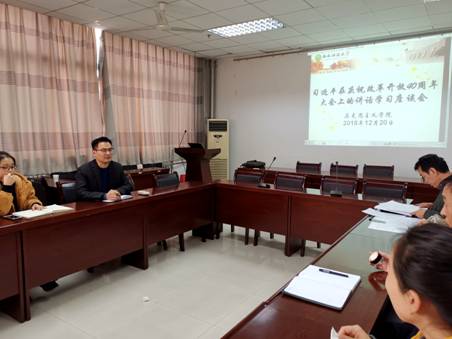 会上,首先由公司党委书记袁金群全文领学了习近平总书记在庆祝改革开放40周年大会内容,并就讲话内容进行深入解读,分析了改革开放40年来我国的发展变化。然后,经理高振岗谈了自己对习近平总书记重要讲话精神的学习心得,并提出要将讲话精神融入到本科和研究生思政课课堂的方案,提出要组建“全国教育大会暨习近平总书记在庆祝改革开放40周年讲话精神宣讲团”,为全校本科生及其他院系的研究生进行宣讲。与会的博士、硕士研究生代表也谈了自己的学习心得体会,表示要将讲话精神与学习、科研结合起来,不断提高学术研究水平。