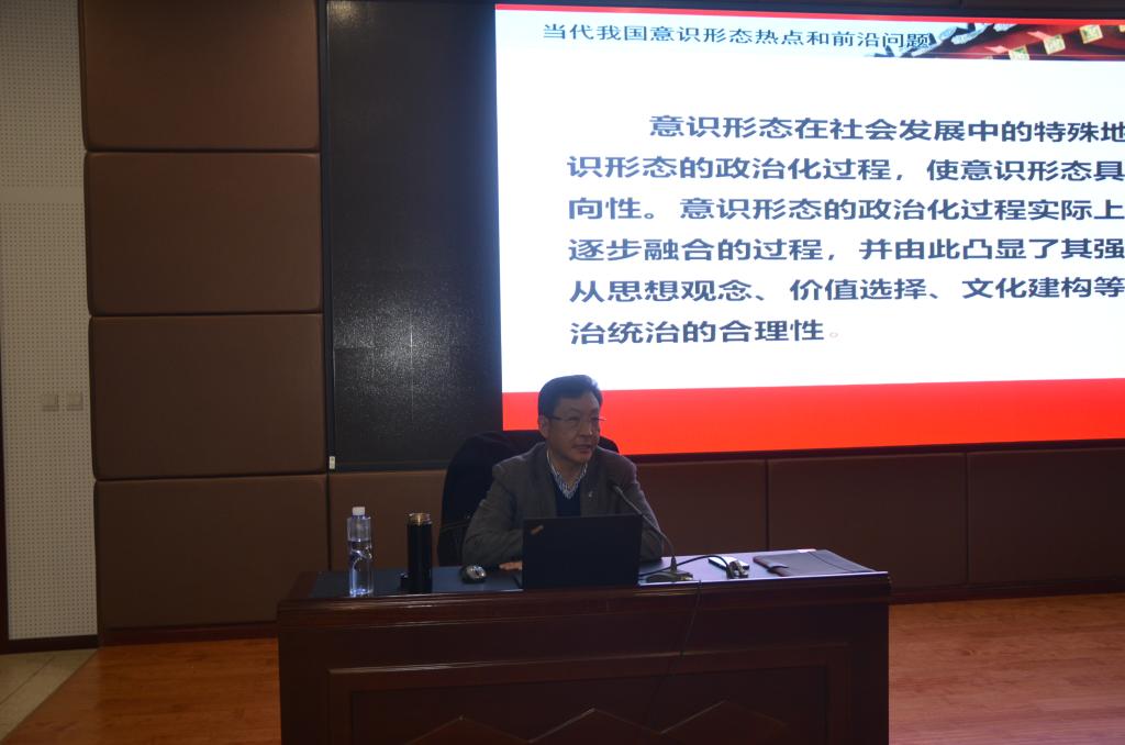王岩教授围绕当前我国意识形态主旋律,结合当前意识形态领域的热点问题,通过列举丰富的案例,进行了深入的讲解。通过对新时代、百年未有之大变局、社会主义核心价值观的解读,他指出当前对于习近平新时代中国特色社会主义思想的研究变即时宣讲为精准理解、变情感解读为理性审视、变精神领会为科学践行、变政治表达为学术阐释、变条块梳理为体系研究。针对新冠肺炎疫情期间,国内意识形态领域“真相与谣言同台竞技”的形势,他强调要正确理解“黑天鹅”、“灰犀牛”事件,及时应对各种突发事件。