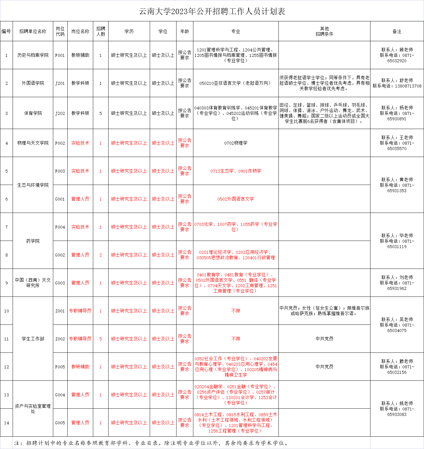 (一)各招聘单位联系方式详见《云南大学2023年公开招聘工作人员计划表》(附件1);