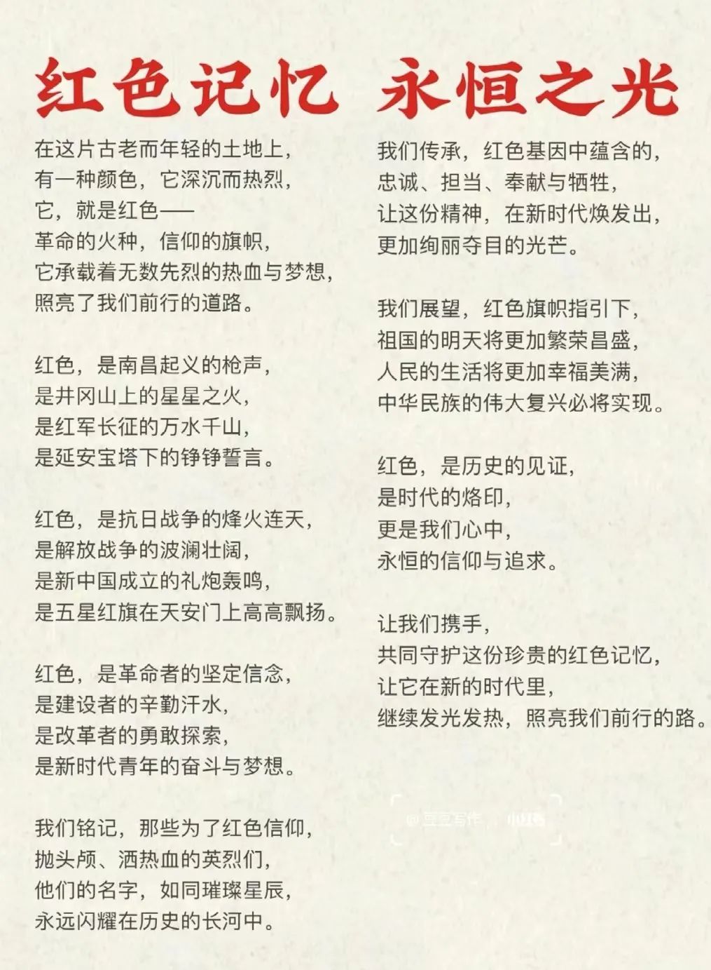 在朗诵的尾声,我们深情缅怀那些为了红色信仰,抛头颅、洒热血的英烈们。他们的名字,如同璀璨星辰,永远闪耀在历史的长河中。正是有了他们的牺牲与奉献,才有了我们今天的幸福生活。让我们铭记历史,砥砺前行,以实际行动践行红色精神,为实现中华民族的伟大复兴贡献自己的力量。